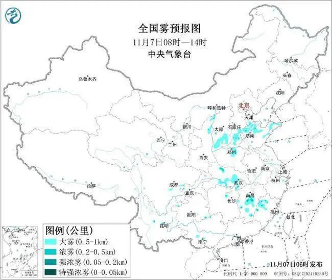 中央氣象臺今天(11月7日)06時繼續(xù)發(fā)布大霧黃色預(yù)警:預(yù)計,7日早晨至上午,河北南部、河南中北部、山東北部和東部、山西南部、湖北南部、江西中部、福建西北部等地的部分地區(qū)有大霧,其中,山東東部、江西中西部、福建西北部等地的部分地區(qū)有能見度不足500米的濃霧,局地有能見度不足200米的強濃霧。