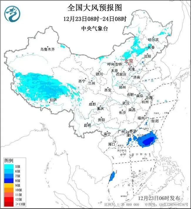 預(yù)計,12月23日08時至24日8時,內(nèi)蒙古中東部、華北北部、黑龍江中東部、吉林西部、遼寧北部及遼東半島、新疆北疆東部及南疆盆地山區(qū)、青海南部、西藏中北部等地有5~6級風(fēng),陣風(fēng)7~8級;巴士海峽、南海東北部將有7~8級、陣風(fēng)9級的大風(fēng),渤海東北部局地海域?qū)⒂?級、陣風(fēng)8級的大風(fēng)。