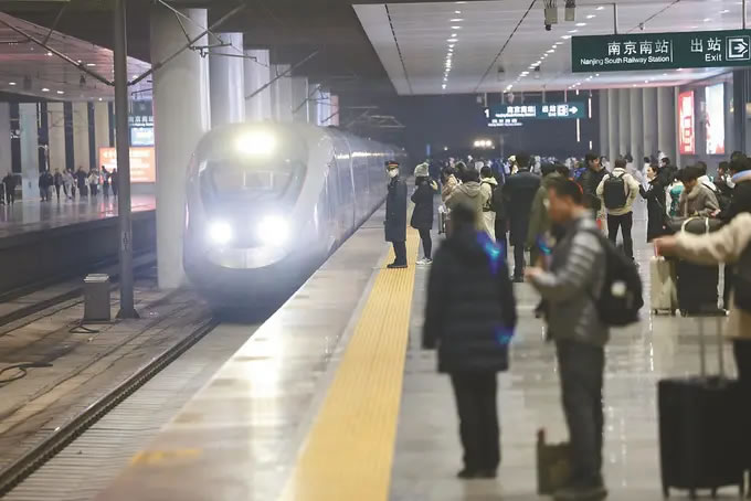 從1月26日零時(shí)起,全國鐵路實(shí)行新的列車運(yùn)行圖,調(diào)圖后,圖定旅客列車較原圖增加243列。京滬高鐵標(biāo)桿列車G25次迎來了“瘦身”升級:這趟京滬間最快高鐵取消原有5個(gè)?空荆瑑H設(shè)南京南站唯一經(jīng)停點(diǎn)。圖為當(dāng)日晚,旅客在南京南站準(zhǔn)備乘坐G25次列車。(陳儼 攝)