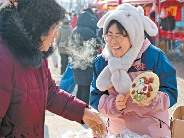 非遺傳承人張鑫瑩(右)在大集上為顧客展示馬年花饃。本報(bào)記者 白繼開攝