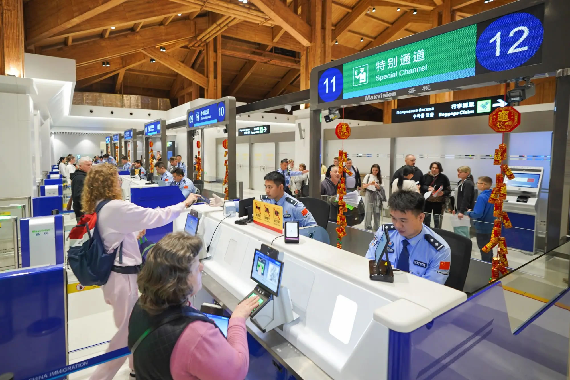 為應(yīng)對春節(jié)假期出入境客流高峰,美蘭、鳳凰出入境邊防檢查站提前發(fā)布客流高峰預(yù)測,實(shí)時監(jiān)測旅客流量變化,加強(qiáng)現(xiàn)場勤務(wù)組織,合理安排執(zhí)勤警力,提前開足查驗(yàn)通道,增設(shè)現(xiàn)場標(biāo)識指引,推出24小時直接過境免辦邊防檢查手續(xù)、外國人入境卡網(wǎng)上填報、團(tuán)體旅游簽證網(wǎng)上申辦等系列便利措施,確保中外旅客高效、順暢通關(guān)。