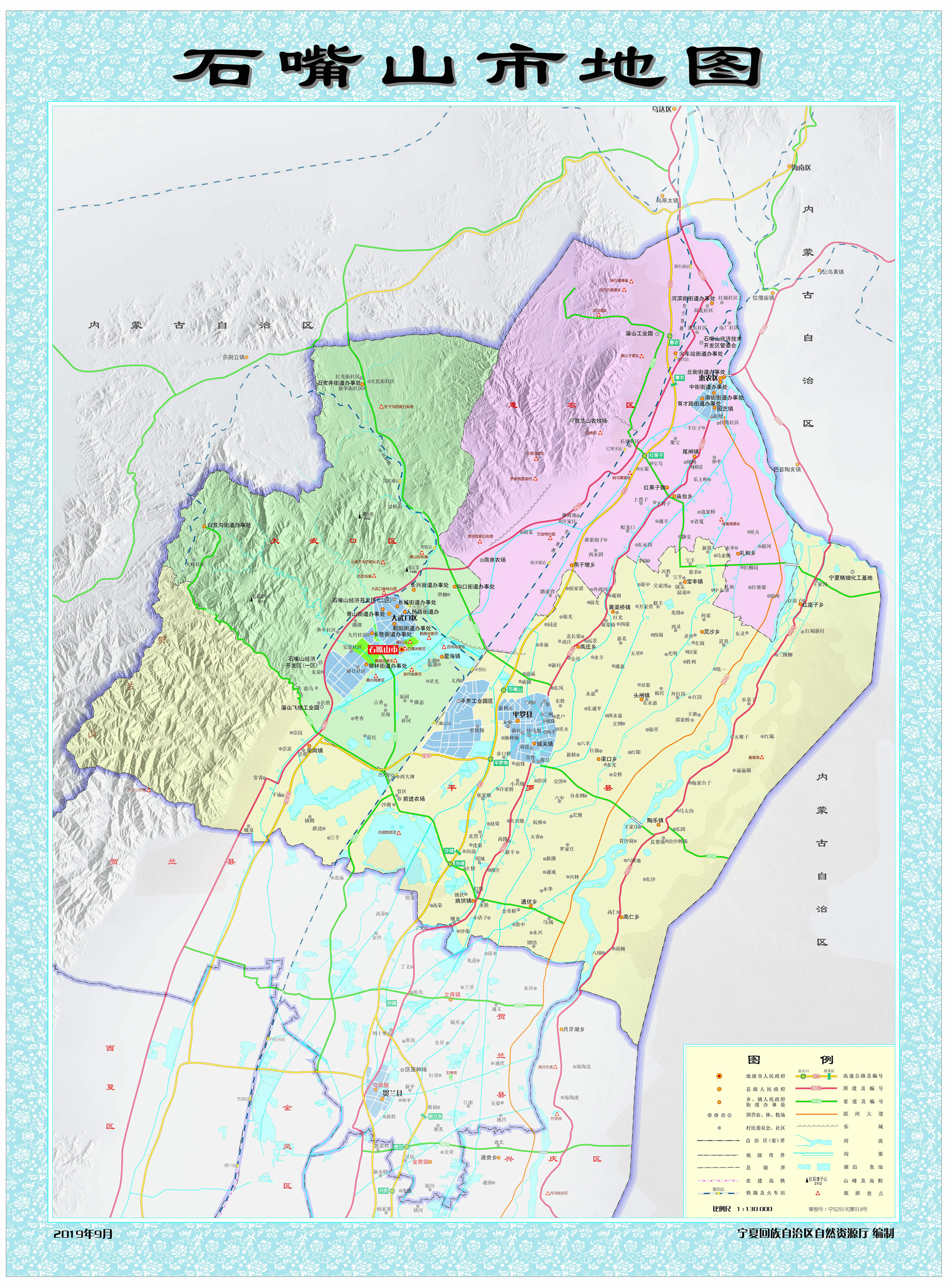 1975年11月23日,撤銷銀北地區(qū),恢復(fù)石嘴山市。石嘴山市因賀蘭山與黃河交匯處“山石突出如嘴”而得名,歷史悠久,秦朝時(shí)設(shè)渾懷障,西漢時(shí)設(shè)置第一個(gè)行政建制——廉縣,悠久歷史造就了厚重的文化底蘊(yùn),孕育了賀蘭山巖畫(huà)、古長(zhǎng)城、北武當(dāng)壽佛寺、平羅玉皇閣、田州塔等人文古跡,擁有移民文化、賀蘭山文化、工業(yè)文化等民宿文化;地理位置較為優(yōu)越,地處寧東、蒙西兩個(gè)國(guó)家千億噸級(jí)煤田之間,是呼包銀蘭經(jīng)濟(jì)帶、寧夏沿黃經(jīng)濟(jì)區(qū)、寧蒙陜?yōu)踅鹑墙?jīng)濟(jì)區(qū)的重要節(jié)點(diǎn)城市;距銀川河?xùn)|機(jī)場(chǎng)100千米,包蘭鐵路、京藏高速、烏瑪高速、109國(guó)道、110國(guó)道等貫穿全境,被列為國(guó)家公路運(yùn)輸樞紐城市、區(qū)域流通節(jié)點(diǎn)城市之一;黃河穿東過(guò),西依賀蘭山,湖泊星羅棋布。市境內(nèi)有5A級(jí)旅游景區(qū)沙湖、國(guó)家水利風(fēng)景區(qū)星海湖等風(fēng)景名勝。