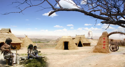 古老的水洞溝村是由北方的先民們創(chuàng)造了窖洞式和地穴式的居室方式。這種居室往往是建在黃土層較厚的山坡或溝岸上,具有冬暖夏涼的特點(diǎn)。水洞溝人在此基礎(chǔ)上改進(jìn)了這種居住方式,發(fā)展成一種半地穴式建筑形式。其方法是在黃土坡上先挖出一定深度的地穴,然后在地穴四壁確定為墻壁的地基上,用土坯(pī)壘墻,使之達(dá)到一定高度,再以桁(xíng)條,木椽搭頂,復(fù)以柴草,柴草上面糊以泥土,防止漏水。水洞溝村就是這樣一個(gè)古老的半地穴式的聚集村落遺址,我國(guó)西北地區(qū)群眾習(xí)稱(chēng)其為“地窩子”。水洞溝村聚落共有29處地穴式建筑遺址,我們選擇了其中的一些進(jìn)行了恢復(fù),讓我們能夠直觀地了解先民們的居住形式。