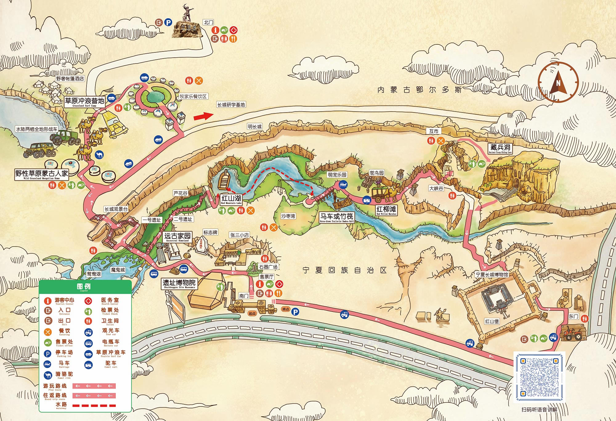 寧夏水洞溝遺址旅游區(qū)位于寧夏靈武市臨河鎮(zhèn),西距銀川市19公里,南距靈武市30公里,距河?xùn)|機(jī)場(chǎng)11公里,地處銀川河?xùn)|旅游帶的核心部位,北與內(nèi)蒙古鄂爾多斯市相接,是連接寧蒙旅游的紐帶,占地面積7.8平方公里。
