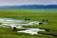 祁連山草原因交融之美,被評為“中國最美的六大草原”之一,具有面積大、草質(zhì)好、類型多、產(chǎn)草量高等特點,有罕見的林中草場。海拔4000以上還有高山積雪形成的碩長而寬闊的冰川地貌奇麗壯觀。進入祁連境內(nèi),放眼望去,滿目盡是草原旖旎的風光。夏季的草原像是廣袤無垠的綠毯,滿山的白藏羊恰似散落的珍珠,黑色的牛毛帳篷、裊裊升起的炊煙、牧人悠揚的歌聲,這一幕如畫風景卻是草原最尋常的景色。