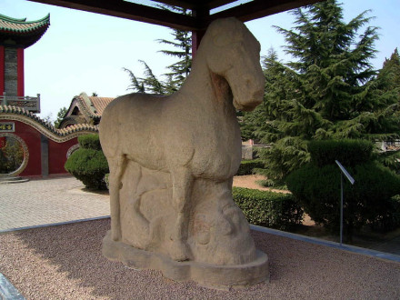 1981年5月在平陽(yáng)公主墓南,西吳鄉(xiāng)竇馬村農(nóng)民在平整土地時(shí)發(fā)現(xiàn)這件文物。高62厘米,長(zhǎng)76厘米,通體銅鑄鎏金,昂首,翹尾,四腿直立,體態(tài)矯健。頭部造型甚為生動(dòng),粉鼻亮眼,兩耳豎立。史書(shū)記載其為“金馬”,系以西漢時(shí)大宛國(guó)的汗血馬為原型而精制的工藝品。這件國(guó)寶,現(xiàn)收藏在茂陵博物館。