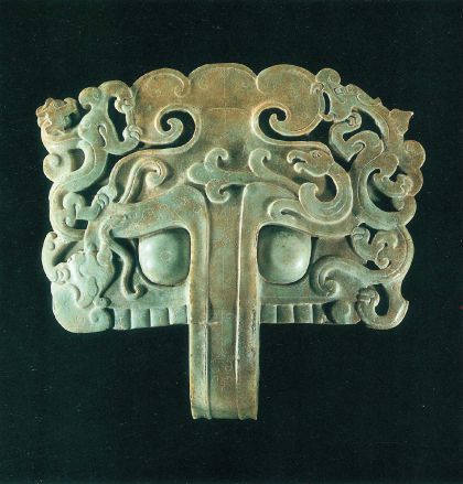 橫寬36.5厘米,灰綠色,下有凸鈕,四角略弧圓,分別碾琢其時(shí)流行的青龍、白虎、朱雀、玄武四神像。器物下方以環(huán)鈕為鼻梁,上連粗眉和暴起雙眼,形成大獸面,下緣則以8條豎紋勾勒出寬大的排牙。圖案化的形象莊嚴(yán)凝重,工藝精美,線條運(yùn)用剛?cè)嵯酀?jì)。