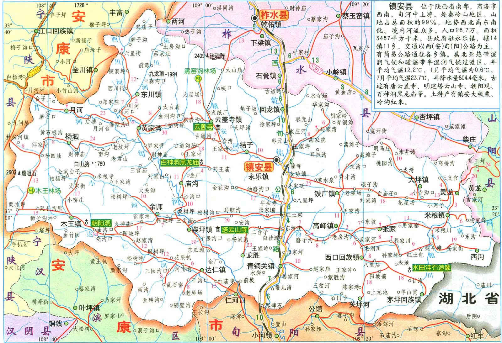 鎮(zhèn)安縣位于秦嶺東段南麓, 位于北緯33.8'至33.48"57',東經(jīng)108 34"35'至109 36"51'。距陜西省西安市195公里,離商洛市178公里。面積3487平方公里。縣委、縣政府駐地永樂鎮(zhèn)(謝家彎)縣城前街188號。境內(nèi)最高點為楊泅鄉(xiāng)鷹嘴石,海撥2601.6米,最低點是龍勝鄉(xiāng)詢河村河谷,海撥344米,高低落差2257.6米,地勢西北向東南傾斜;屬長江水系漢江支流;年均降雨量804.4毫米,年平均氣溫12.2℃,屬亞熱帶半濕潤氣候。