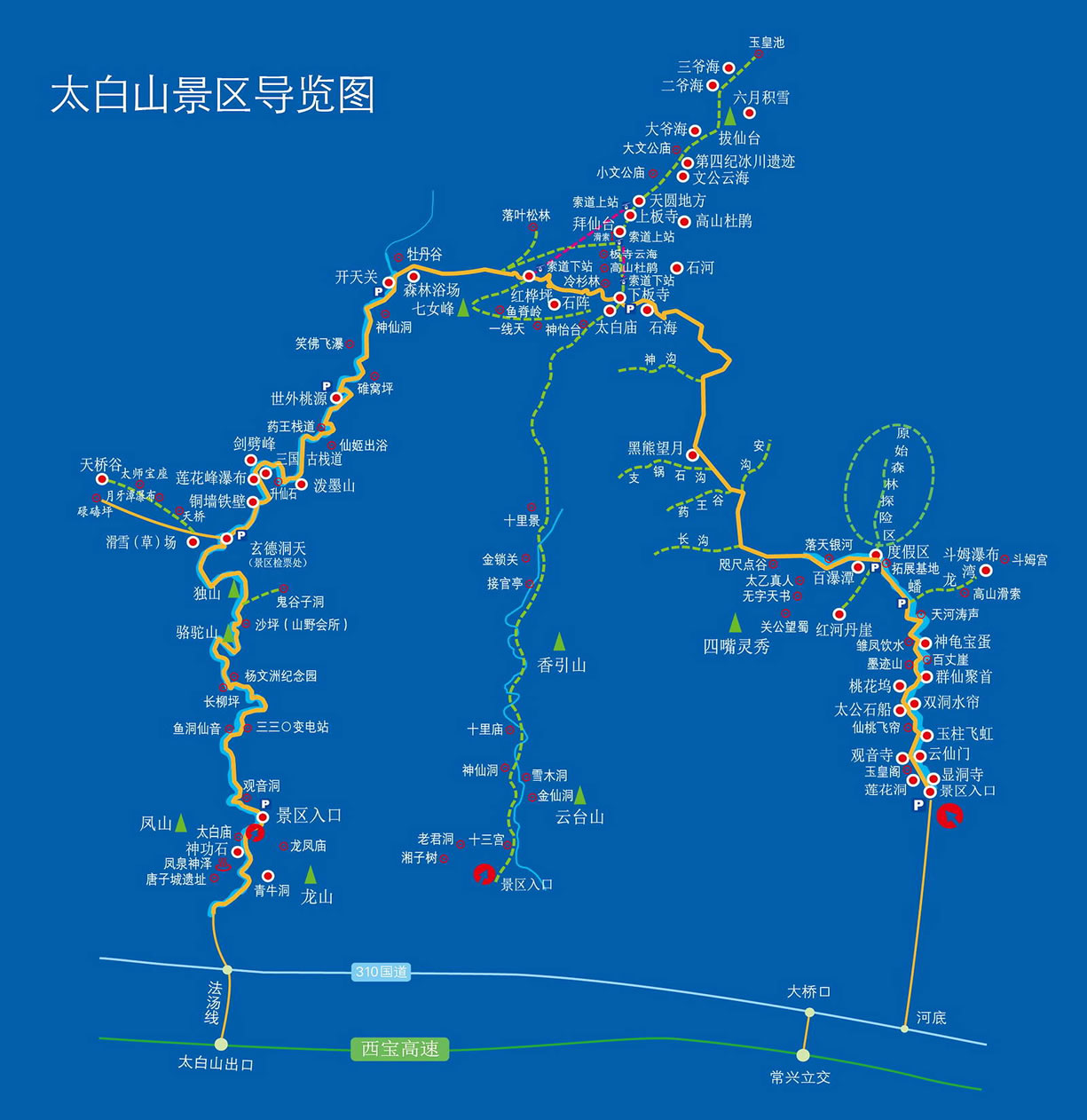 太白國家森林公園以園內(nèi)40公里旅游公路和28公里人行旅游步道聯(lián)結(jié)公園八個景區(qū)140多個景物景點,其主要的景區(qū)景點有: