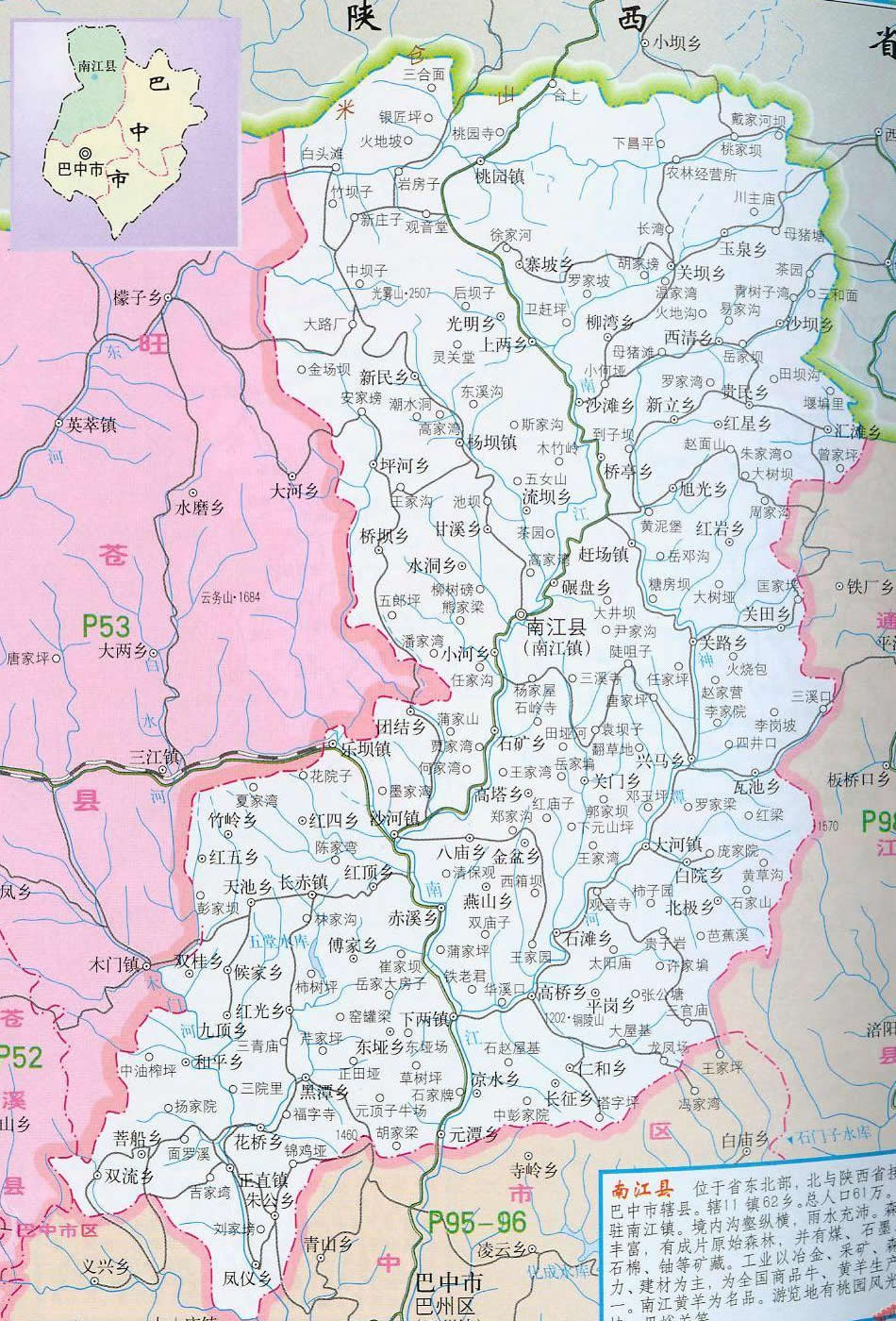 南江縣位于四川北緣米倉(cāng)山南麓,東鄰?fù)ń,南接巴州,西界旺蒼,北靠陜西省南鄭縣。南江古屬巴國(guó),后為集州,先秦兩漢就有政區(qū)建置。南北朝時(shí)期的梁普通六年(公元525年)始建難江縣(取江水難涉之意),距今1480年,明正德十一年(公元1516年)改難江縣為南江縣(江水繞城南而名)至今。 幅員面積3383平方公里,有耕地42.3萬(wàn)畝;總?cè)丝?5萬(wàn)人,總戶數(shù)20.2萬(wàn)戶。全縣轄48個(gè)鄉(xiāng)鎮(zhèn),522個(gè)村,2408個(gè)村民小組,86個(gè)居民委員會(huì)。