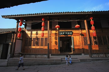 王朝聞故居(添壽堂)位于古鎮(zhèn)進(jìn)士牌坊下側(cè),立木結(jié)構(gòu),是川南典型四合院,面積500平方米,院內(nèi)天井50平方米,有明代古井一口,一方戲樓,三方廂樓,木雕精美。故居分為戲樓、正堂、客廳、臥室、天井、作坊室、偏房等。正堂供奉神龕、神案,左右置太師椅。作坊室是王朝聞少年時(shí)代使用的碾子、龍骨車、風(fēng)簸、簸箕、撮箕、蓑衣、斗筐、鋤頭、犁耙等。