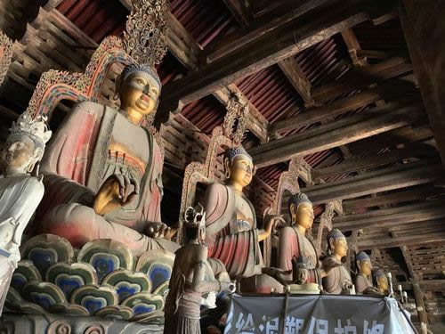觀音閣內(nèi)中央的須彌座上,聳立著一尊高16米的泥塑觀音菩薩站像,菩薩頭部直抵三層的樓頂。因其頭上塑有十個(gè)小觀音頭像,故又稱之為“十一面觀音”,菩薩面容豐潤、慈祥,兩肩下垂,軀干微微前傾,儀態(tài)端莊,似動(dòng)非動(dòng)。觀音塑像兩側(cè)各有一尊脅侍菩薩塑像,塑像是遼代的原塑,雖制作於遼代,但其藝術(shù)風(fēng)格類似盛唐時(shí)期的作品,是我國現(xiàn)存的最大的泥塑佛像之一。