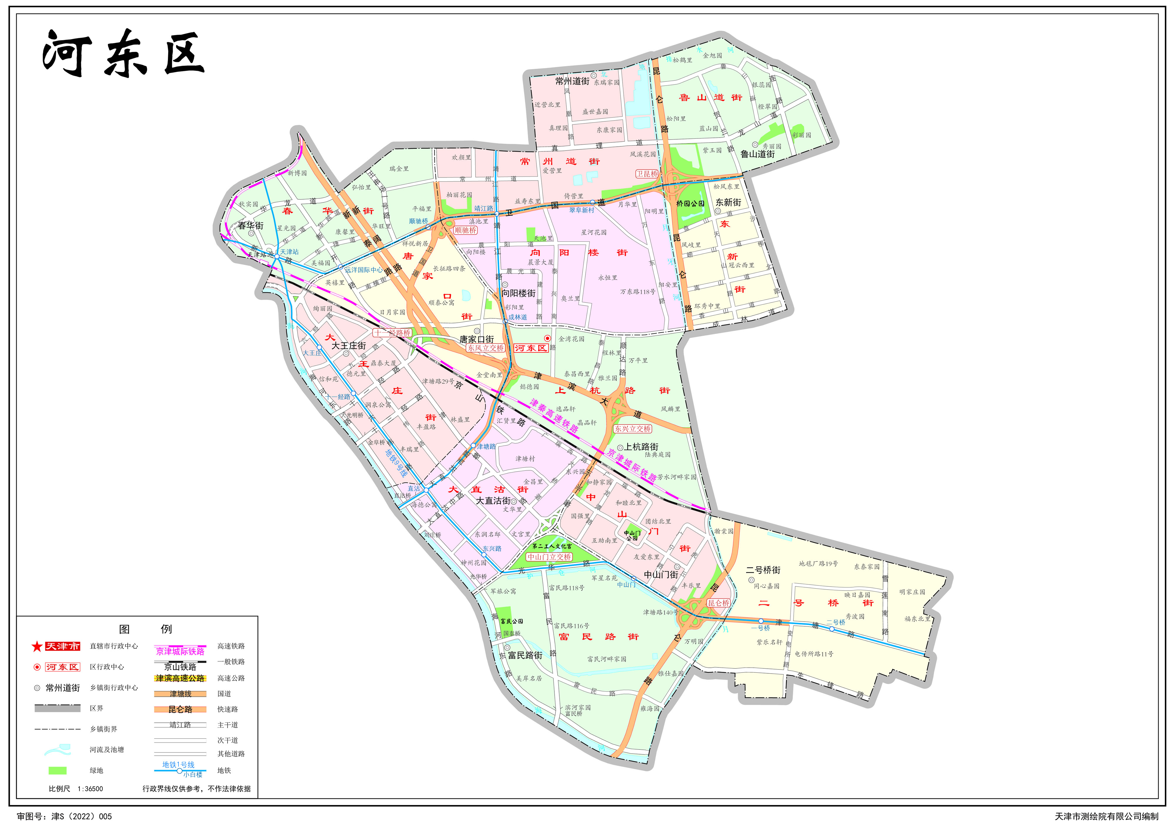 河?xùn)|區(qū)轄13個(gè)街道:大王莊街道、大直沽街道、中山門街道、富民路街道、二號橋街道、春華街道、唐家口街道、向陽樓街道、常州道街道、上杭路街道、東新街道、魯山道街道、天津鐵廠街道