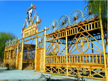 風(fēng)格獨(dú)特、氣勢宏偉的大門就是刀郎人民俗村寨門。造型似刀郎人英雄男兒形象,體現(xiàn)刀郎人的勇敢彪悍、不屈不撓、勤勞智慧、熱愛子民的硬漢精神。