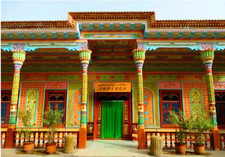 這座民族特色濃郁,極具刀郎人建筑風(fēng)格的宴藝廳就是刀郎部落招待貴賓及聚會、就餐、欣賞刀郎歌舞的場所。餐廳裝飾工藝主要為刀郎人傳統(tǒng)的石膏雕、木雕和磚雕。墻面上色彩艷麗,植物花卉圖案的是石膏雕,回廊上的木柱子為木雕,據(jù)說這樣的一根柱子需要兩個(gè)工匠花一個(gè)月時(shí)間才可完成。屋檐最上面一層為磚雕。刀郎部落宴藝廳可容納300人就餐,在品嘗地道刀郎美味的同時(shí)還可欣賞刀郎歌舞表演。