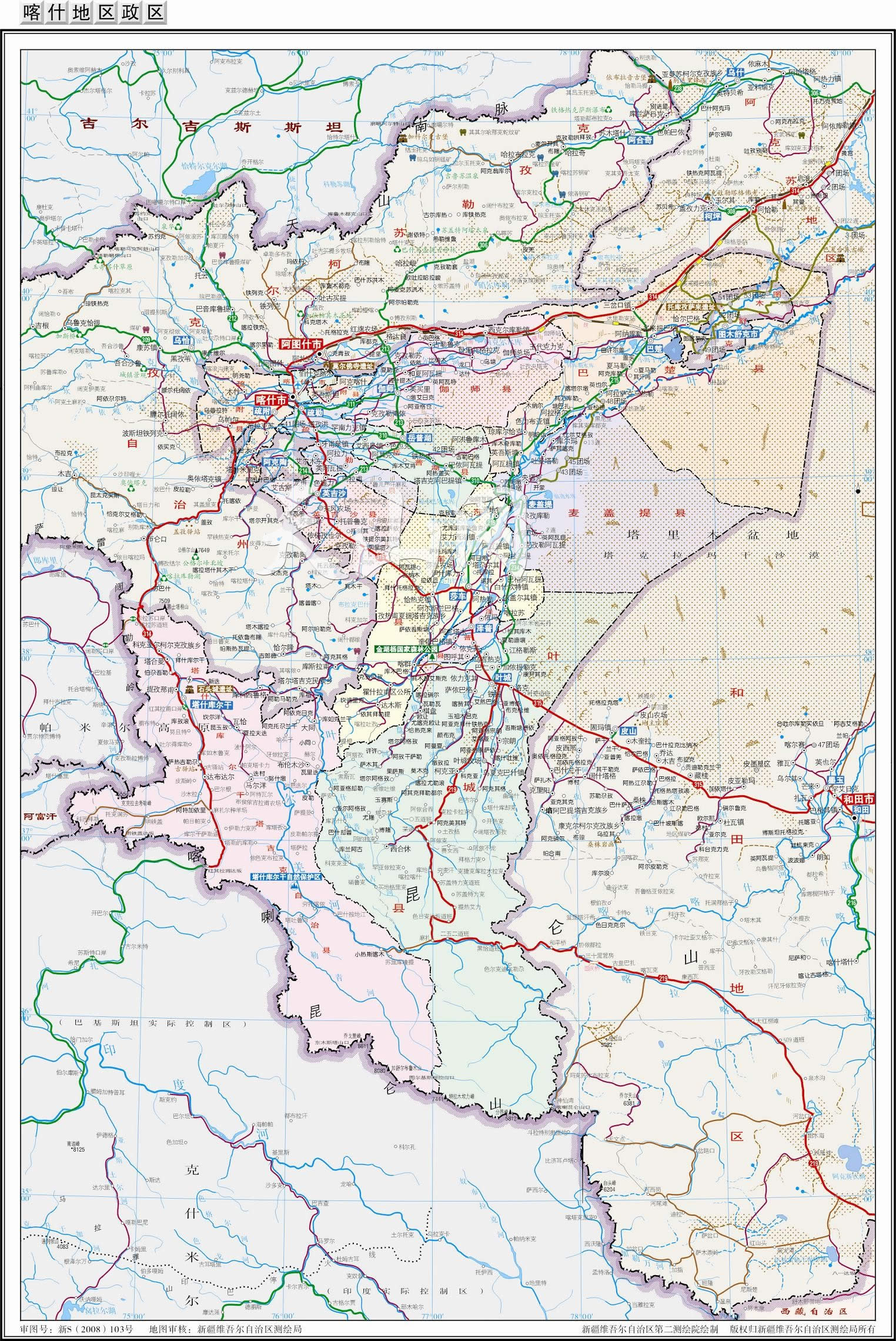 莎車縣 面積8957平方千米,人口891392,政府駐葉爾羌街道,下轄5個(gè)街道、14個(gè)鎮(zhèn)、15個(gè)鄉(xiāng)