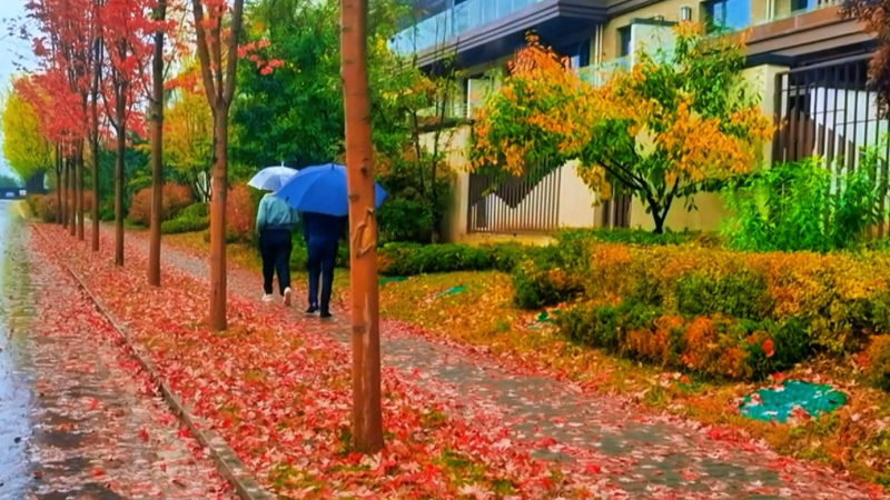 小鎮(zhèn)的雨,是天地間最奇妙的調(diào)色盤,它懂得用豐富的色彩調(diào)和季節(jié)的輪回。打濕銀杏時,雨便成了金黃;灑落楓樹時,雨便成了火紅;浸潤松柏時,雨又化作濃綠……長街、小路被洗的油亮,早落的黃葉,粘在濕漉漉的石面上,像一枚精致的書簽,應(yīng)和著“秋雨梧桐葉落時”的意境;路上的行人并不匆忙,而是踏著雨聲的節(jié)拍,在“斜風細雨不須歸”的悠然中,邂逅墻角那叢“菊散金風起”的絢爛。偶有身著旗袍的女子,撐一把油紙傘,在飄落一地的紅楓葉上款款漫步。那身影穿過雨幕,恍若從水墨長卷中走出的意象,在現(xiàn)實與夢境之間翩翩起舞;雨聲里飄來山居食堂的暖香,水汽與雨霧在空中交融,織就“寒夜客來茶當酒”的溫潤時光。