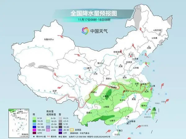 中央氣象臺預計,今天,內(nèi)蒙古東北部、黑龍江東部、吉林東部、河南西南部、陜西東南部、湖北西北部等地部分地區(qū)有小到中雪或雨夾雪,其中,陜西東南部、湖北西北部等地局地有大雪;江淮西部、江漢、江南北部和西部、西南地區(qū)東部和南部、華南北部和西部等地部分地區(qū)有小到中雨。