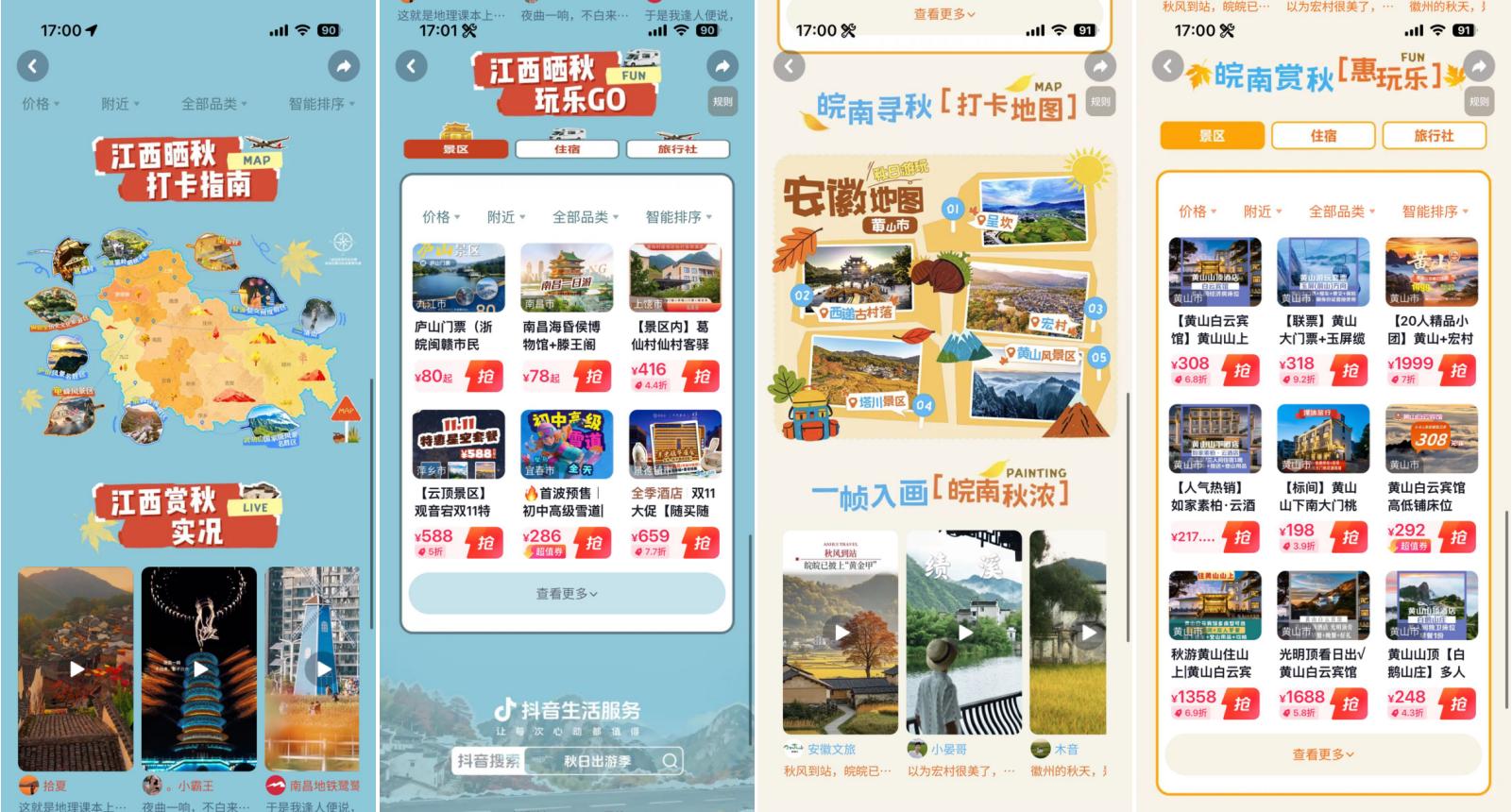 抖音深度響應(yīng)用戶對(duì)季節(jié)限定體驗(yàn)的需求,以“秋日儀式感”為切入點(diǎn),聯(lián)動(dòng)江西和安徽多城自然人文類商家,分別發(fā)起#來江西曬個(gè)秋 與#賞皖南秋意濃 話題活動(dòng),累計(jì)收獲話題總播放量2945萬,用戶投稿4275條,相關(guān)搜索UV突破406萬,同比增長19%。從江西婺源的篁嶺景區(qū)到安徽黃山的三塔景區(qū),從葛仙村的千燈夜游到三清山的云海勝景,抖音平臺(tái)的內(nèi)容生態(tài)與交易場景實(shí)現(xiàn)深度融合,推動(dòng)江西與安徽兩地文旅目的地整體支付達(dá)GMV2.22億元,同比增長246%,讓從發(fā)現(xiàn)出行靈感至完成目的地消費(fèi)的全過程更加順暢自然。