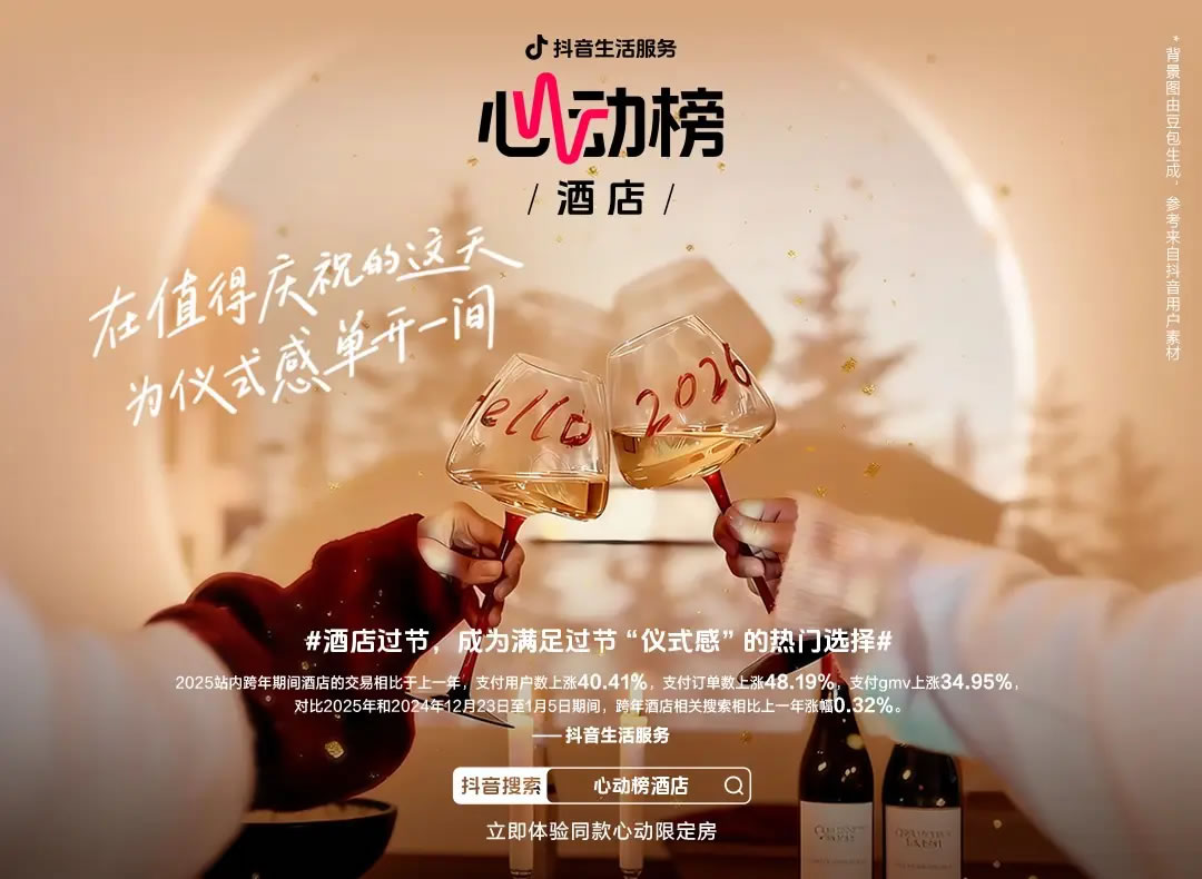 在這場全民性儀式感浪潮中,抖音生活服務(wù)推出的「心動榜酒店」之跨年航班和紅人派對,精準切入并引爆了市場熱度,數(shù)據(jù)顯示,圍繞此類活動的內(nèi)容播放量和參與度屢創(chuàng)新高。酒旅行業(yè)的競爭邏輯,正在從傳統(tǒng)的“目的地與價格”之爭,全面升級為 “場景營造與情緒共鳴”, 抖音正試圖重塑高端酒店的消費體驗,并重新定義節(jié)假旅行的消費決策路徑。