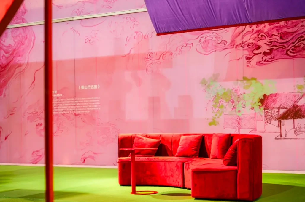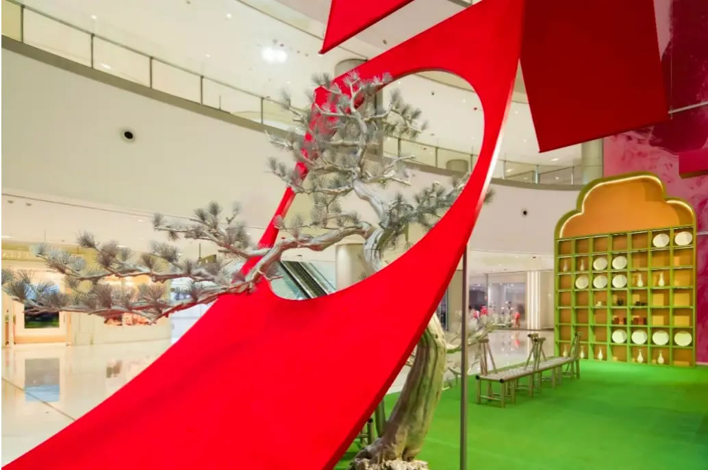山水,并非遠(yuǎn)行才可得見。書法水墨藝術(shù)家劉玥首展作品《春山行遠(yuǎn)圖》以20米巨幅“山水開卷”,步入其中,與天地春意從容照面;紅色的帷幔落于銀色的松枝上,就像于山間松下靜謐的一隅,“幕下棲心”將是絕佳開年時(shí)尚大片的打卡處;松下銀椅,為你與摯友“漫敘往來(lái)”的相聚時(shí)刻營(yíng)造出寧?kù)o、松弛的氛圍;多寶閣中陳列著未經(jīng)雕琢的茶器素胚與場(chǎng)內(nèi)品牌萬(wàn)仟堂,長(zhǎng)沙尼依格羅酒店及tea'stone帶來(lái)的新春茶器,以“初芒蘊(yùn)能”詮釋著未來(lái)的無(wú)限可能與新生力量。轉(zhuǎn)身與“蒔光種愿” 四方亭相遇。葫蘆門朝四方而開,寓意著納四方福祿,步入其中,與數(shù)字交互藝術(shù)家吳旭首展作品《無(wú)限福祿》體驗(yàn)互動(dòng),跟隨指引揮動(dòng)手勢(shì),觸發(fā)粒子凝聚為動(dòng)態(tài)“福”字,親手完成一場(chǎng)新春祈福儀式。我們把象征團(tuán)圓與喜悅的紅色沙發(fā)打造“盞間聚暖”,如懷抱般圍合的布局作為“歸處”的隱喻。與家人團(tuán)聚便是心歸處,這將是中國(guó)年最圓滿的意象。