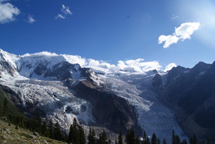 該冰川常年雪光閃耀,景色神奇迷人。這是典型的現(xiàn)代季風(fēng)型溫性冰川,類型齊全,尤以巨大的冰盆、眾多雪崩、陡峭巨大700-800米的冰瀑布、消融區(qū)上游的冰面弧拱構(gòu)造以及冰川末端冰湖和農(nóng)田、村莊共存為特點。