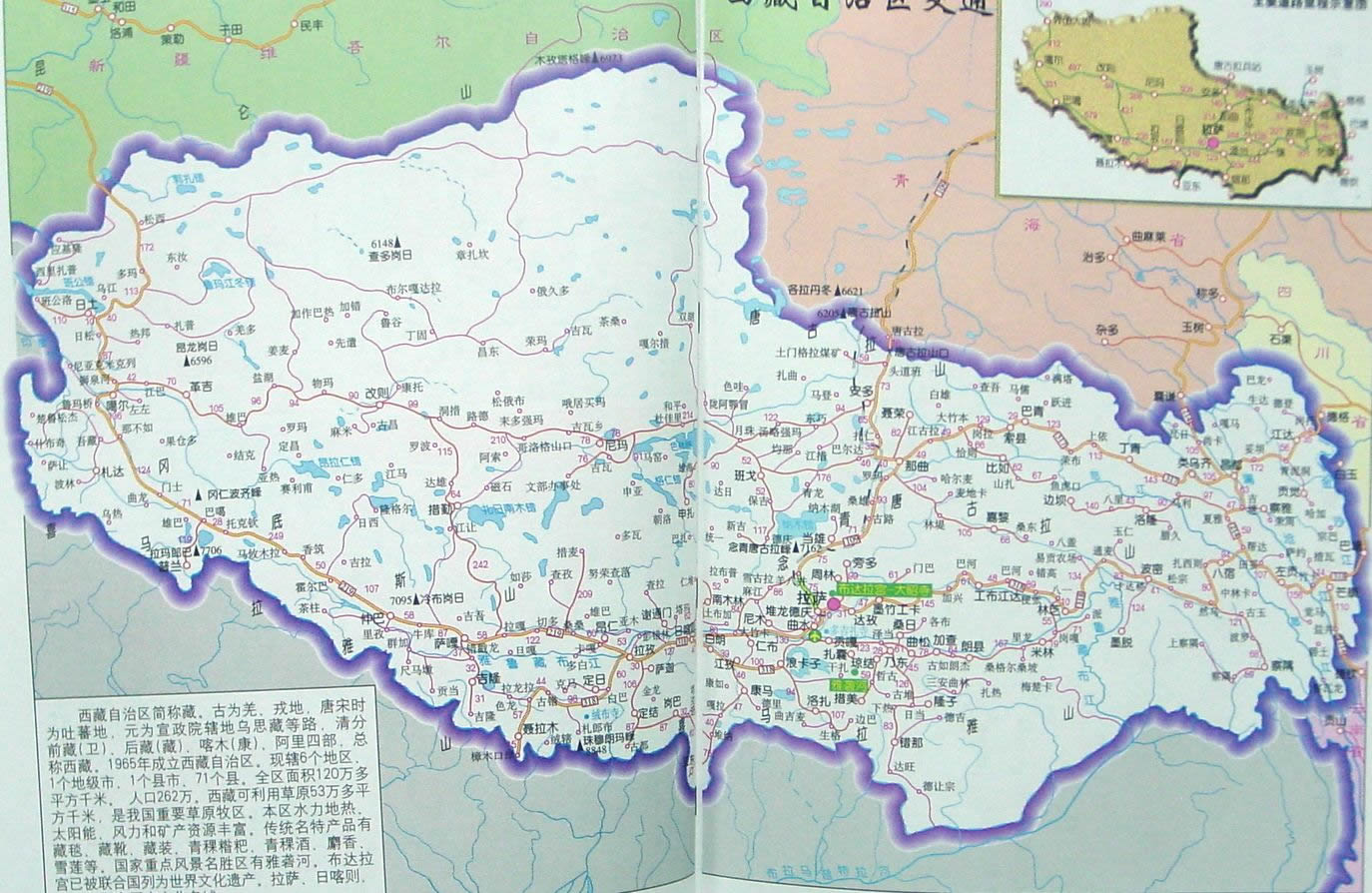 西藏自治區(qū)的首府是拉薩市,拉薩(藏語意為“圣地”)是西藏的政治、經(jīng)濟、交通、文化、宗教中心。西藏地勢高峻,海拔超過8000米以上的山峰就達11座,屹立在中尼邊境的珠穆朗瑪高達8848.13米,是世界第一高峰,又稱為“地球第三極”。在西藏中部和北部有岡底斯山、念青塘古拉山、昆倉山和塘古拉山等山脈。在東部是著名的橫斷山脈地區(qū)。山脈與山脈之間,分布著高原和谷地。