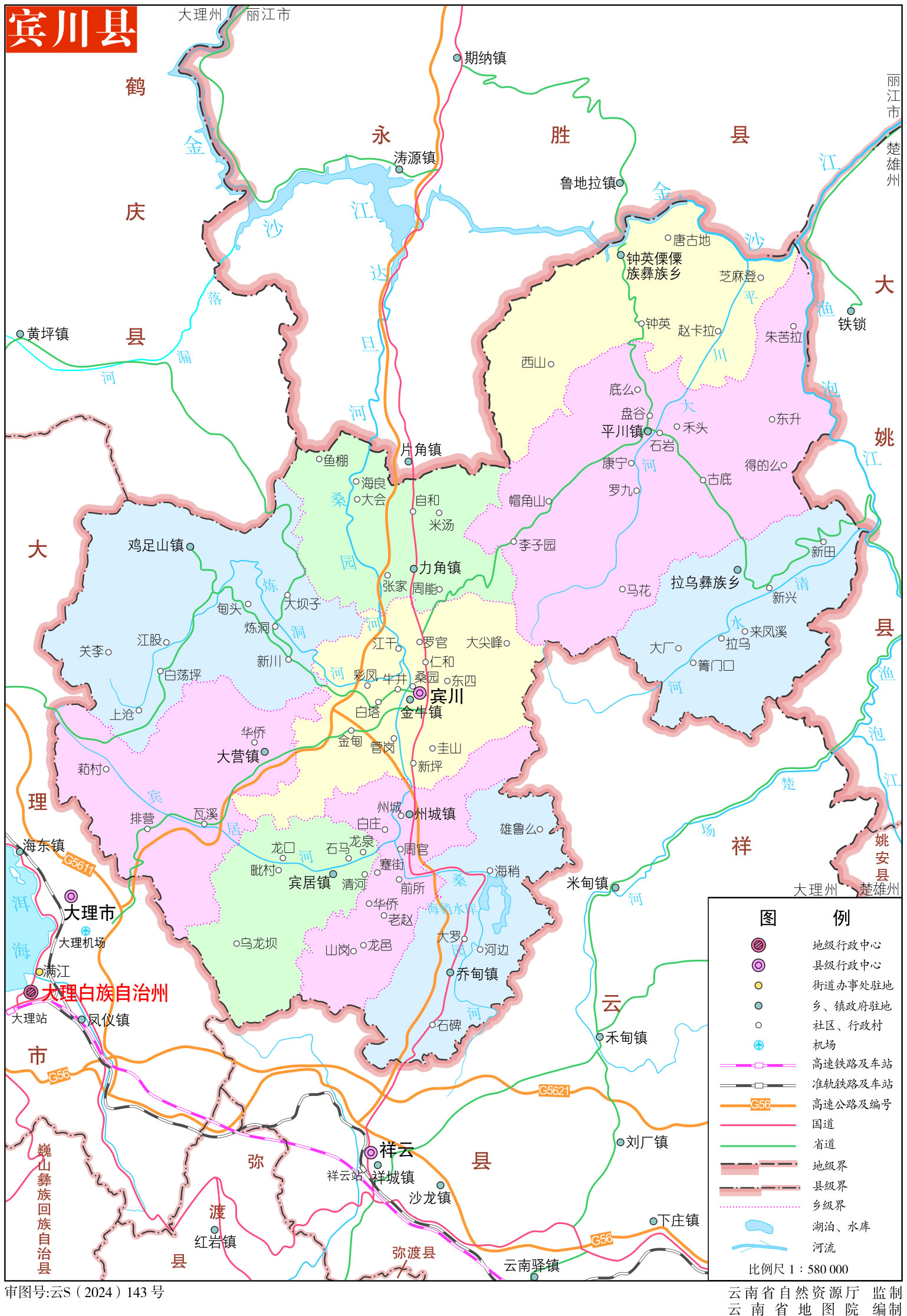 鎮(zhèn):金牛鎮(zhèn)、賓居鎮(zhèn)、州城鎮(zhèn)、大營(yíng)鎮(zhèn)、雞足山鎮(zhèn)、力角鎮(zhèn)、平川鎮(zhèn)、喬甸鎮(zhèn)