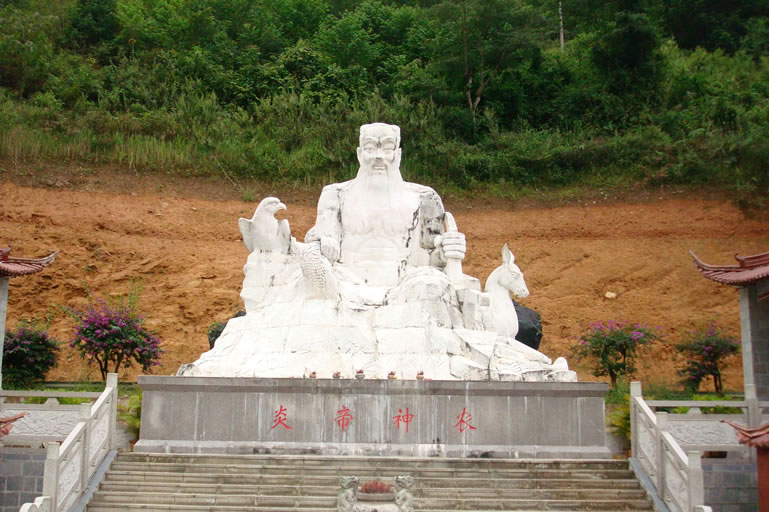 神農(nóng)祠:位于雙江自治縣勐庫鎮(zhèn)北部南勐河上游,勐庫大雪山萬畝野生古茶樹群落山腳的古茶谷中心地帶。祠內(nèi)塑有一尊采用雪花白石雕制而成的炎帝神農(nóng)塑像,高9.5米,基座9米,寬4米。對稱建有兩間傳統(tǒng)民族風格房屋,左為茶展館(以茶之源、茶之魂、茶之歌三個方面用54張圖片展示雙江勐庫大葉茶原生地形象和茶葉產(chǎn)業(yè)發(fā)展情況),右為茶藝館(在墻體上精心制作一幅反映雙江拉祜族、佤族、布朗族、傣族飲茶習俗為主的壁畫,高2米,長13.8米)。塑像基座四周及中心廣場共鋪貼大理青石板530.9平方米,從神農(nóng)祠牌坊至炎帝神農(nóng)塑像共有69級臺階。