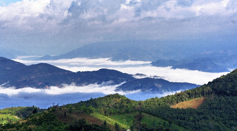 十層大山,也稱為寬羅珊山,是一座座落于中國云南省、越南奠邊省及老撾豐沙里省的山峰,為三國邊界的交界點(diǎn),海拔1864米。山頂被稱為雞鳴三國,豎立有一塊花崗巖界碑,分別書寫中國、越南、老撾3國文字的界碑面向著各國的領(lǐng)土。