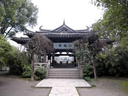 孤鶴軒位于沈園中部,是新辟建園林部分的景觀中心。北臨大荷花池宋池,與東北邊濱水小榭逼遙相對(duì),西邊緊靠六朝井,南邊是遺物壁和明池。軒為單檐歇山頂兩面帶廊的敞廳,平面為倒“凸”字形,寬而臨水。構(gòu)架為仿宋式木構(gòu),下為青石欄板圍起的挑空平臺(tái),造型秀麗曲雅。孤鶴軒亦稱“孤鶴哀鳴”處,是陸放翁的自喻。偉大愛國詩人陸游因南宋朝廷昏庸,壯志難以實(shí)現(xiàn),發(fā)出孤鶴的哀鳴,以孤鶴自喻,隱喻詩人在人生中痛失伴侶,事業(yè)上報(bào)國無門、愛民有罪、屢遭貶職的坎坷一生。亭內(nèi)有“亭池”遺址,1985年考古發(fā)掘時(shí)在此發(fā)現(xiàn)唐亭閣和明代的假山、魚池遺址!肮满Q軒”匾額分為內(nèi)外兩塊,內(nèi)匾額由著名書畫家、文物鑒定家謝稚柳題寫,亭外由大康敬書。